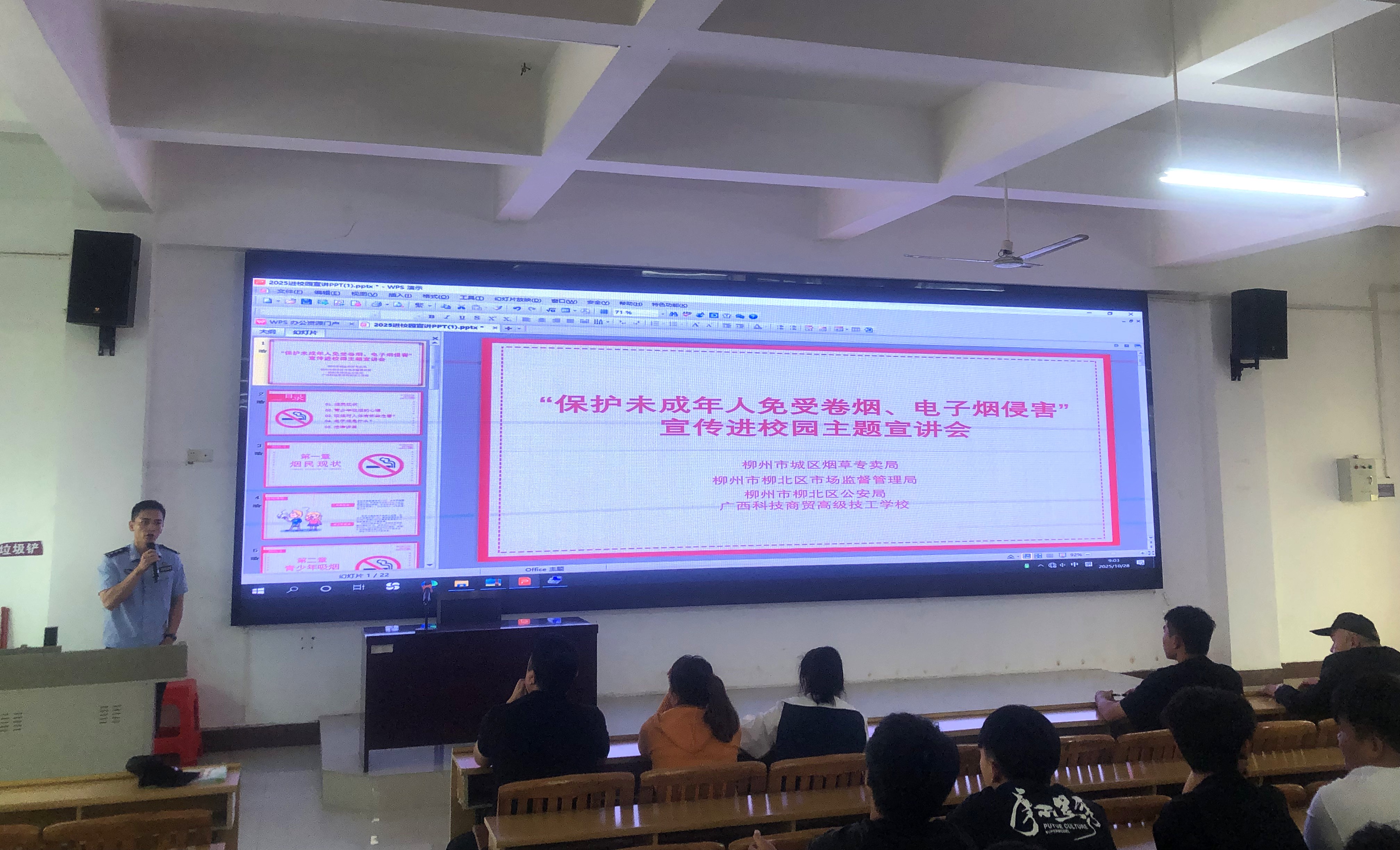 10月28日下午,我校柳北校区(南区)联合柳北区市场监督管理局、城区烟草专卖局及柳北公安局,成功举办了一场内容扎实、意义深刻的烟草危害教育讲座。